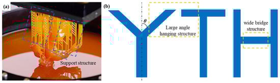 On the other hand, stereolithography (SLA) is currently a relatively mature 3D printing technology, which is widely used in hydrogel printing, flexible capacitors, and medical pre-operation simulation. The materials used in SLA generally consist of light-sensitive polymer precursors, active diluents, cross-linking agents, photoinitiators, and other auxiliary materials [26]. During the printing process, SLA utilizes UV light as the energy source, focuses the laser beam via the scanning galvanoscope, directs it to the surface of the print substrate, and selectively hardens the liquid photo-setting resin layer by layer, where each layer is fully hardened in a few seconds [27]. It has the advantages of high speed, high efficiency, and a wide range of material adaptability [28,29]. However, SLA also faces some problems, e.g., in the process of structural design and manufacturing of the soft actuator, the model structure, placement position, and direction will have a decisive impact on the molding quality of the model. For example, the support structure (as shown in Figure 2a) is required to ensure the complete printing and molding of the model when the model contains a large angle hanging or wide bridge structure (as shown in Figure 2b). Since the support structure is an inseparable part of the overall printed model, a series of post-processing operations are required to remove the support structure after printing is completed and to process the traces left by the support structure. Therefore, we need to combine the characteristics of SLA molding to reduce unnecessary support structures and post-processing to ensure the molding quality of the model in the design and manufacture of soft actuators. In addition, it is also necessary to consider reasonable structural parameters to reduce unnecessary stress concentration and radial expansion, making its bending deformation movement accurate and increasing its service life and performance. At present, most research results only focus on material properties and the SLA molding process [30,31,32], such as rheological behavior, tensile elongation, tunable mechanical behavior, and multi-material printing performance, etc., but there are a few research results on its bending and gripping properties.