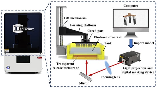 The experiment was conducted using a UV 270 light-curing 3D printer (Beijing 3D Bot Technology Co., Ltd., Beijing, China). The molding size was 115 mm × 65 mm × 160 mm, the layer thickness was 0.025–0.1 mm, and the XY resolution was 2560 × 1440 pixels. The 3D model was horizontally sliced via a computer-aided design. The slices were then converted into 2D mask images, and the mask images were projected onto the bottom of a resin tank using a light projection device to cure the photopolymer resin. After curing one layer, the platform was first raised to separate the cured layer from the tank bottom and then lowered to create a gap with the tank to cure the next layer. The 3D solid mold was created by selectively curing successive layers of resin, which were repeatedly fused to themselves and to the previous layer under UV light. Figure 3 shows the SLA equipment and the schematic diagram.
