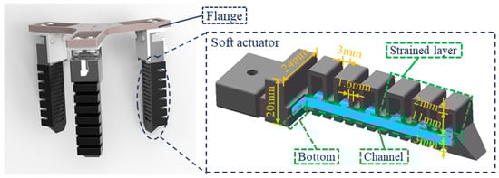 In order to test the viability of the SLA process for the direct manufacturing of a soft-picking manipulator, we designed a soft-picking manipulator using SoildWorks software (version 2021). The designed soft manipulator is combined with the action of grasping objects with the hand. When grasping objects, the three fingers of the hand can pick up objects with little force. If two fingers are used, the grasping force exerted is large, causing a large deformation of the surface of the object and damage to the fruit, and the grasping stability is poor. If the number of fingers increases, it can improve the grasping stability, but it also increases the difficulty of control and the manufacturing cost. Therefore, three soft actuators are selected and circularly distributed on the flange in this study. The specific structure and main structure parameters are shown in Figure 4. Each soft actuator is mainly composed of strain layer, channel, and the bottom three parts, and each adopts the integrated folding structure design to allow large overall deformation without high local strain. Among them, the strain layer adopts a multi-chamber structure. When the air pressure is increased, the air flows through the channel and fills the chamber, causing the soft actuator to bend and deform.
