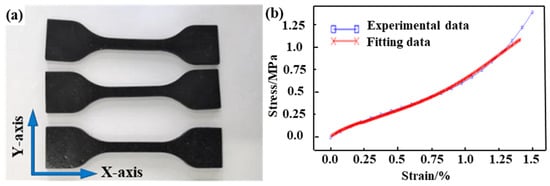 The tensile test is based on standard ASTM D412. The specimens were printed using an SLA printer. Figure 5a shows the printed specimens and print direction, and they are tested via the tensile test, where the speed of the tensile test is 10 mm/min. The fitting curve of the stress and strain was obtained via the tensile test as shown in Figure 5b. The constitutive equation of silicone rubber resin is obtained by using the Yeoh model. The stress–strain data of the tensile test are evaluated. The Yeoh model parameters for the silicone rubber resin are C10 = 0.98 and C20 = 0.37.