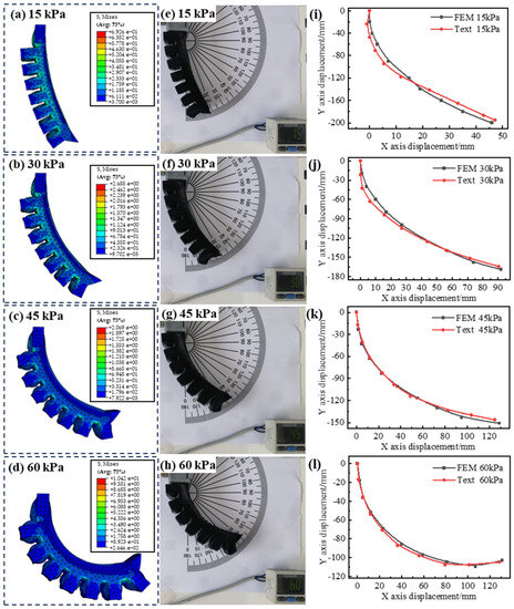 In this paper, finite element simulation using Abaqus software (version 6.14-4) is used to simulate the bending performance of the soft actuator in order to predict the feasibility of the designed soft actuator structure. We varied the applied pressure from ΔP = 0 to 60 kPa and simulated the bending performance of the actuator, as shown in Figure 7a–d, and the bending angle of the soft actuator gradually increases as the driving pressure increases.