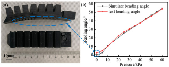 In order to verify the correctness of the simulation results of the bending performance of the soft actuator, we transferred the slicing file to the SLA 3D printer according to the designed soft actuator structure for printing and forming. The soft actuator after printing is shown in Figure 8a, and the printed soft actuator has a good surface quality. Compared with traditional molding methods, the manufacturing process is greatly simplified due to the overall printing of the software driver and the avoidance of the bonding process. However, when the air pressure is not passed through, the soft actuator has a certain initial bending angle (about 2.3°). This may be due to the fact that silicone rubber resin has a certain shrinkage, after the light-curing molding, the internal structure of the soft actuator is hollow and the bottom layer is thicker; the thicker the layer, the greater the shrinkage, and the actuator will bend to the bottom; thus, it has a certain initial bending angle.