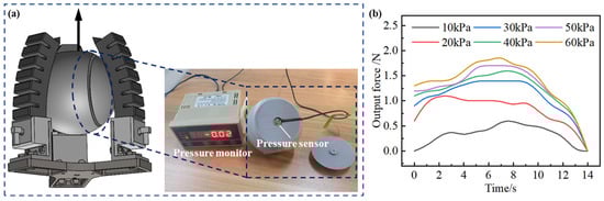 The output force of the soft actuator directly affects the fruit and veg holding capacity, and in order to characterize the output force of the soft actuator, the test device was built as shown in Figure 9a. The small ball in the figure represents the object to be grasped, with a pressure sensor embedded inside. The ball is moved outward in the direction of the actuator at a speed of 5 mm/s. The pressure sensor is used to measure the change in output force of the soft actuator as the ball slips. The ball is made of polylactic acid (PLA) as a matrix material and is produced on an FDM 3D printer with a diameter of ø75 mm.