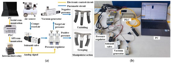 The test platform of the soft-picking manipulator consists mainly of the pneumatic circuit, the electronic control circuit, and the mechanical arm. The pneumatic circuit is connected to the soft-picking manipulator through gas pipes and joints and includes an air pump, pressure regulator, solenoid valve, vacuum generator, etc. The electronic control circuit consists mainly of the main computer, relays, and the DAC module. The control system diagram of the soft-picking manipulator is shown in Figure 10. Among them, the components used in the pneumatic circuit are connected via a pneumatic connector, and the pneumatic pressure gauge data is returned to the programmable logic controller (PLC) and the PC via the signal line, where the electric control circuit is controlled via the PC and PLC solenoid valve for reversing, and then the positive and negative pressure of the driving air pressure is controlled to achieve the grasping and unfolding actions of the soft manipulator.