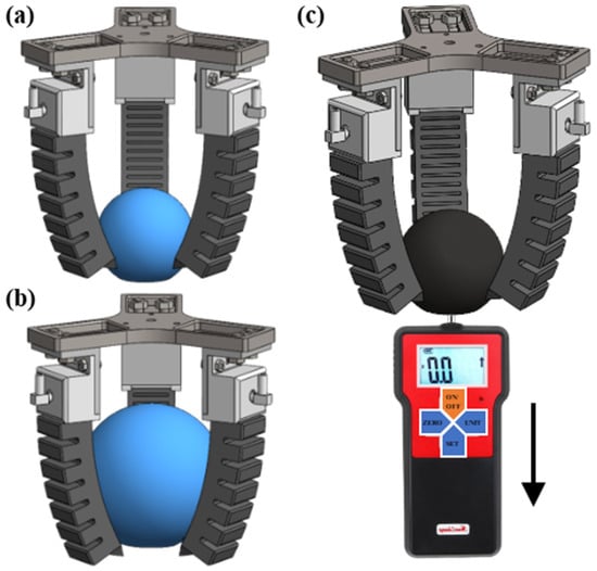 In order to test the grasping force of the above two grasping methods, we installed the soft manipulator on the platform and used the dynamometer to test the grasping force under different driving pressures. The grasping test procedure is shown in Figure 11c. In the grasping test, we think that the sum of the maximum indicator number of the dynamometer and the weight of the target object when the target object falls from the soft manipulator is the final grasping force. The target object materials used in the test are all made of polylactic acid and manufactured via the fused deposition modeling (FDM) 3D printer. Among them, the diameter of the object used in the fingertip grasping test is 50 mm and the weight is 23.63 g. The diameter of the object used in the envelope grasping test is 75 mm and the weight is 70.92 g.
