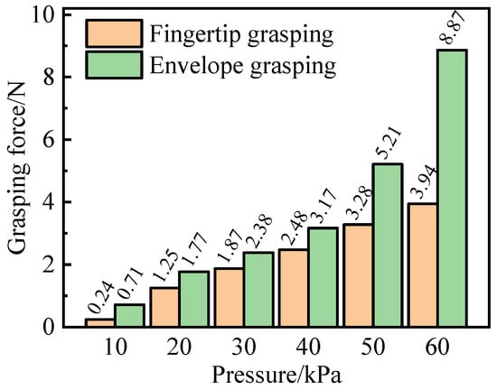 The grasping force results under different grasping methods are shown in Figure 12; as the driving pressure increases, the gripping force of the soft manipulator also increases. When the pressure increases to 60 kPa, the grasping force of fingertip grasping and envelope grasping reaches the maximum, reaching 3.94 N and 8.87 N, respectively. The grasping test results show that the grasping force of envelope grasping is obviously greater than the grasping force of fingertip grasping under the same driving pressure. This is because the contact area between the manipulator end and the target object is small, and the end grasping force is mainly used to overcome the target object’s gravity. In the envelope grasp, the contact area between the soft manipulator and the target object is large, and the friction generated by the contact, coupled with the clamping force generated by the bending of the soft manipulator, makes it have a greater grasping force and further increases the grasping stability.