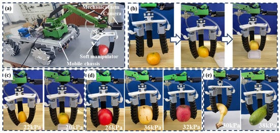 As shown in Figure 13b, taking the soft manipulator to grasp an orange as an example, the grasping process is mainly divided into the following steps: Firstly, the pneumatic circuit is controlled to input negative pressure to make the soft manipulator open and move directly above the target object; secondly, the target object is approached and the positive pressure is controlled to make the soft manipulator grip and clamp the fruit or vegetable; finally, the mechanical arm is lifted, the mobile chassis and the soft manipulator are driven to move to the target position, and the soft manipulator opens to place the target object in the specified position to complete the grasping process.