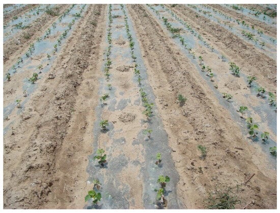 In a study conducted by Dong et al. [53], it was found that combining plastic mulching with furrow seeding resulted in more significant improvements in stand establishment and yield compared to using either mulching or furrow seeding alone (Figure 2). These improvements were attributed to several factors. Firstly, the uneven distribution of salts in the soil was reduced, leading to reduced sodium (Na+) uptake by both the roots and leaves of cotton plants. Secondly, the elevated soil temperature under the plastic mulch, combined with improved moisture availability in the root zone, facilitated better conditions for seed germination and seedling growth. Additionally, these conditions also contributed to a decrease in lipid peroxidation in cotton tissues, reducing cellular damage. Finally, enhanced photosynthesis was observed, which likely contributed to the improved overall growth and productivity of the cotton plants. Based on these findings, the integration of plastic mulching with furrow bed seeding appears to be a promising technique for cotton production in saline areas.