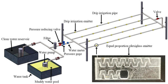 - Qin, C.; Zhang, J.; Wang, Z.; Lyu, D.; Liu, N.; Xing, S.; Wang, F. Anti-Clogging Performance Optimization for Shunt-Hedging Drip Irrigation Emitters Based on Water–Sand Motion Characteristics. Water 2022, 14, 3901. [Google Scholar] [CrossRef]