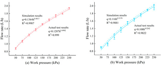 The highest (No. 16) and lowest (No. 7) sand passage rates of the drip irrigation emitter were selected for the test, and the flow–pressure curves of the drip irrigation emitter were obtained via regression analysis of the experimental results and numerical simulation results are shown in Figure 4. The dashed line represented the simulation results. The solid line represented the actual test results. The flow index (test values) calculated using Equation (1) for the two sets of test schemes were 0.4902 and 0.5242, indicating that the hydraulic performance of the drip irrigation emitter was good. The flow rate error of the No. 16 drip irrigation emitter was 2.4%~4.1%, and the flow rate error of the No. 7 drip irrigation emitter was 2.1%~5.8%, which had good accuracy and feasibility [29]. The flow rate error of the No. 7 drip irrigation emitter was greater than the No. 16 drip irrigation emitter at the working pressure of 100 and 125 kPa. The reason was that there were technique errors in the models produced by high-precision engraving machines; the hydraulic performance of the No. 7 drip irrigation emitter was lower than the No. 16 drip irrigation emitter and more sensitive to changes in working pressure. The actual working pressure range used was less than 100 kPa. The error of flow rate for two types of drip irrigation emitters below 100 kPa was 2.6% and 3.8%, respectively. The selected structural parameters had certain practical value for the design of drip irrigation emitters.