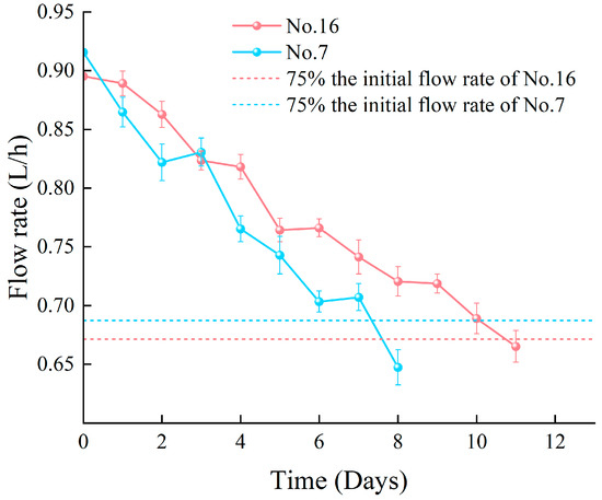 The relationship between the number of days tested and the flow rate for drip irrigation emitters (No. 16 and No. 7) is shown in Figure 5. The flow error of the No. 16 drip irrigation emitter was approximately between 2.2% and 3.7%, and the flow error of the No. 7 drip irrigation emitter was 2.9%~4.3%. The flow rate on day 0 was measured from the clear water test and it was considered the initial flow rate. An initial flow rate of 75% was set as the threshold (the flow rate of the drip irrigation emitter measured under the clear water test), and when the measured flow rate falls below 75% on a given day, the drip irrigation emitter is considered to be clogged, otherwise, it is unclogged. The flow rate of both drip irrigation emitters decreased as the test time increased, and both drip irrigation emitters (No. 16 and No. 7) were clogged when using muddy water. In the eighth test, the flow rate of the No. 16 drip irrigation emitter was not below the threshold, and it was not considered to have clogged. The No. 7 drip irrigation emitter was considered to have clogged. The structural parameters had a significant impact on the anti-clogging performance of the drip irrigation emitters.