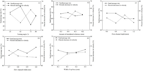 The results of the flow channel structural parameters of the drip irrigation emitter on the sand passage rate and the percentage decrease in velocity are shown in Figure 6. The sand passage rate and percentage decrease in velocity trend line had the greatest degree of variation in E1, with a range of 39.26~91.48% for sand passage rate and 40.47~58.31% for percentage decrease in velocity. The degree of variation of the trend line for E2 to E4 was lesser. The maximum changes in the sand passage rate and the percent decrease in velocity were 5.75% and 10.38%. The change in the width of top base in E5 had no effective effect on the sand passage rate and the percentage decrease in velocity. The sand passage rate could be maximized with the 65° turning angle. When the amount of interdental reference was −0.4 mm, the flow channel depth was 0.8 mm, and the flow channel width was 1 mm, it is the most suitable parameter to improve the sand passage rate.