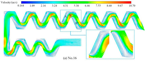 Flow channel flow vector diagram. (a) No. 16 and (b) No. 7.