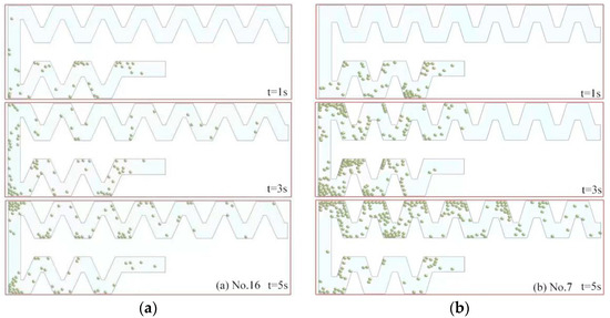 Figure 8a,b showed the distribution of sand particles in the flow channel of No. 16 and No. 7 drip irrigation emitters, respectively. The fastest time for sand particles to pass through the entire flow channel of the No. 16 and No. 7 drip irrigation emitter was 2.8 s and 3.98 s, respectively, and the maximum retention time was 6.56 s and 9.56 s, respectively. There were fewer sand particles in the vortex area of the No. 16 drip irrigation emitter, and the distribution of sand particles in each unit was more uniform. Most of the sand particles could flow stably in the main flow area.