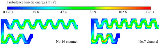Turbulence kinetic energy distribution in flow channels No. 16 and No. 7.