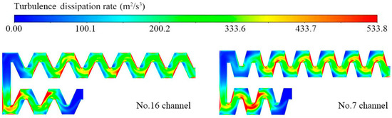 Distribution of turbulence dissipation rate in flow channels No. 16 and No. 7.