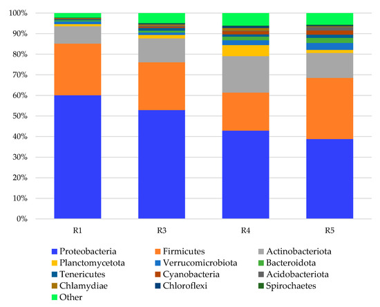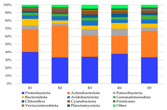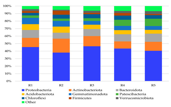 Relative abundance of dominant phyla of bacteria in 2020. The classifications with less than 1% abundance are gathered into the category “other” (R1—agricultural soil; R2—replanted soil; R3—replanted soil with Tagetes patula L. foregut; R4—replanted soil with Sinapis alba foregut; R5—replanted soil with Raphanus sativus var. oleifera foregut).