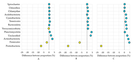 Relative abundance of dominant classes of bacteria phyla in 2019 (A—R3 via R1; B—R4 via R1; C—R5 via R1). The classifications with less than 1% abundance are gathered into the category “other” (R1—agricultural soil; R3—replanted soil with Tagetes patula L. foregut; R4—replanted soil with Sinapis alba foregut; R5—replanted soil with Raphanus sativus var. oleifera foregut; “yellow” means negative difference; “blue” means positive difference).