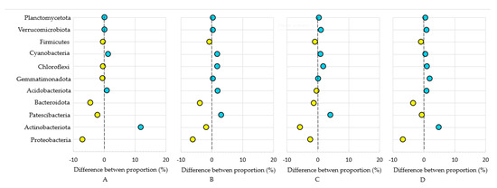 Relative abundance of dominant classes of bacteria phyla in 2020 (A—R2 via R1; B—R3 via R1; C—R4 via R1; D—R5 via R1). The classifications with less than 1% abundance are gathered into the category “other” (R1—agricultural soil; R2—replanted soil; R3—replanted soil with Tagetes patula L. foregut; R4—replanted soil with Sinapis alba foregut; R5—replanted soil with Raphanus sativus var. oleifera foregut; “yellow” means negative difference; “blue” means positive difference).