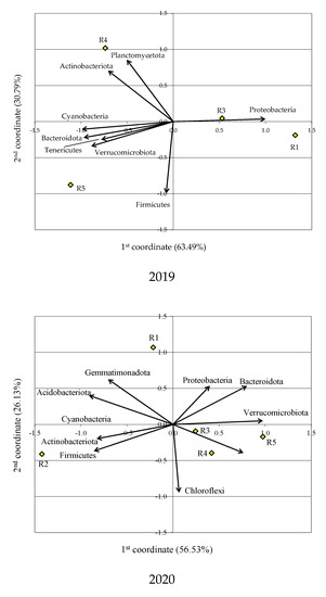 In 2019, regardless of the experimental variant, Firmicutes bacteria were the most dominant phylum (Figure 2). In the following years of the research, the count of Actinobacteriota increased and was greater than the counts of other bacterial phyla (Figure 3 and Figure 4). The intensive growth and development of Actinobacteriota were particularly noticeable in variant R2. According to Swędrzyńska and Małecka-Jankowiak [56] as well as Niewiadomska et al. [57], Actinobacteriota are a saprophytic group of actinobacteria that quickly adapt to unfavourable environmental conditions, such as desiccation. Therefore, they actively decompose organic matter when the soil moisture is low.