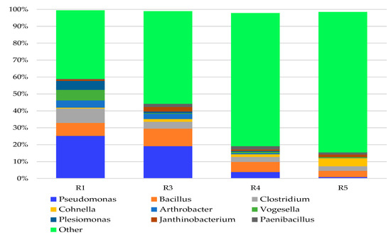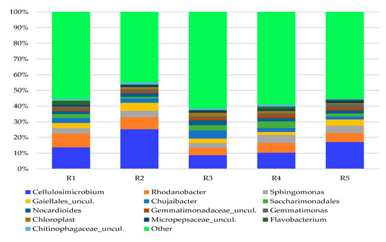 Relative abundance of the dominant (rodzaj) genus of bacteria in 2019. The classifications with less than 1% abundance are gathered into the category “other” (R1—agricultural soil; R2—replanted soil; R3—replanted soil with Tagetes patula L. foregut; R4—replanted soil with Sinapis alba foregut; R5—replanted soil with Raphanus sativus var. oleifera foregut).