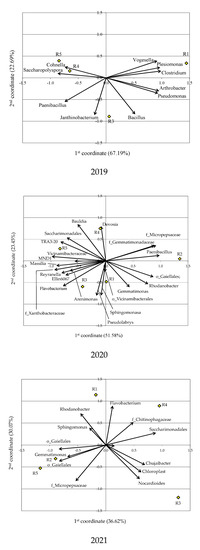 The aforementioned changes in the qualitative and quantitative composition of the bacterial microbiome caused by the previous use of soil and the effect of phytosanitary plants enabled the identification of microorganisms, which can be regarded as bioindicators of soil fertility. According to Fierer et al. [55], in order to better understand the soil regeneration process, it is important to know both the communities of microorganisms inhabiting the soil and their interrelationships. The principal component analysis (PCA) revealed the relationships between the different types of soil bacteria in the experimental variants during the three years of the research (Figure 8). It showed that soil biodiversity ranged from 71.19% to 94.28%. It also showed that the relationships between the different types of bacteria were related to the year of the study. Regardless of the experimental variant, in the first year of the study, the analysis revealed a clear correlation between the percentage of taxonomic sequences of the Verrucomicrobiota, Bacteroidota, Cyanobacteria, and Tenericutes phyla and between Actinobacteriota and Planctomycetota. A similar relationship between Verrucomicrobiota and Bacteroidota was also observed in the second year of the study (Figure 8). However, in 2020 and 2021, there was a correlation between the percentage of OTUs in the Proteobacteria phylum and Bacteroidota, which was in line with the results of the study by Fazi et al. [63].