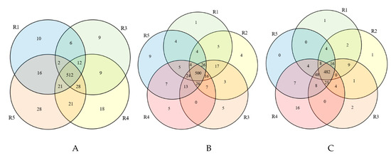 Venn diagram of overlapping bacterial communities (phyla) (A—2019; B—2020; C—2021). (R1—agricultural soil; R2—replanted soil; R3—replanted soil with Tagetes patula L. foregut; R4—replanted soil with Sinapis alba foregut; R5—replanted soil with Raphanus sativus var. oleifera foregut.); the numbers indicate the number of unique bacterial sequences.