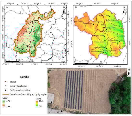 Geographical location of the experiment site: (a) Geographic location of the loess–hilly region; (b) Geographic location of the study area; (c) Aerial view of the test area.
