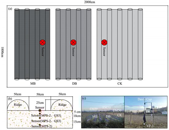 Field test layout: (a) Planar graph; (b) Cutaway drawing; (c) Photograph. MB means plastic membrane–geotextile cloth mulching on the ridge, DB means geotextile cloth mulching on the ridge, and CK means bare soil ridge. EM50 is a data logger for sensors. MPS-2 is a soil water potential and soil temperature sensor, and GS3 is a soil moisture sensor. Davis Cup is a wind speed and direction sensor. ECRN-100 is a rain gauge.