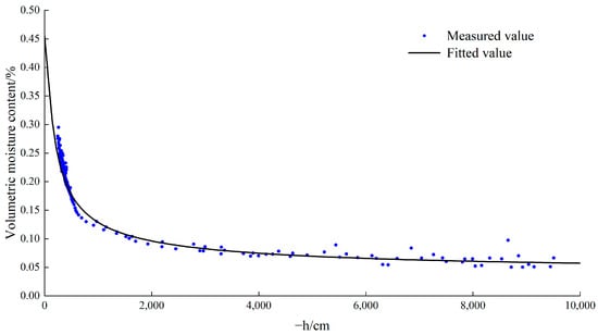 The data were fitted using the least squares method for θr, θs, α, n, and m: θr = 0.0345, θs = 0.4552, α = 0.0108, n = 1.62, and m = 0.3827 (NRMSD = 0.053).