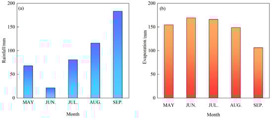 Monthly rainfall and evapotranspiration during the growing period: (a) Monthly rainfall; (b) Monthly evaporation.
