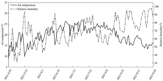 The changes in air temperature and relative humidity near the surface during the monitoring period are shown in Figure 5. The average air temperature during the monitoring period was 19.7 °C, the highest was 27.0 °C (July 15), and the lowest was 8.8 °C (April 28). The relative humidity fluctuated greatly, and the average value during the monitoring period was 69.8%, with a maximum of 98.2% (September 26) and a minimum of 31.44% (May 7).