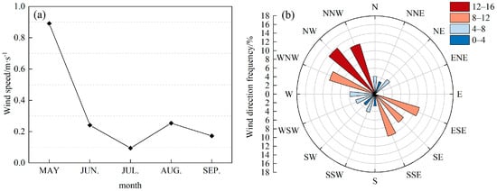 The wind speed and wind direction frequency during the monitoring period are shown in Figure 6; the maximum average wind speed was 0.9 m·s−1 (in May), the minimum was 0.1 m·s−1 (in July), and the wind speed variation was characterized by “large in spring, small in summer and autumn”, according to the statistics of the test station during the study period. The frequency of still wind accounted for 1.6%, easterly wind accounted for 19.2%, southerly wind accounted for 20.5%, westerly wind accounted for 35.1%, and northerly wind accounted for 23.6%, which shows that the study area is dominated by northwest and southeast winds.