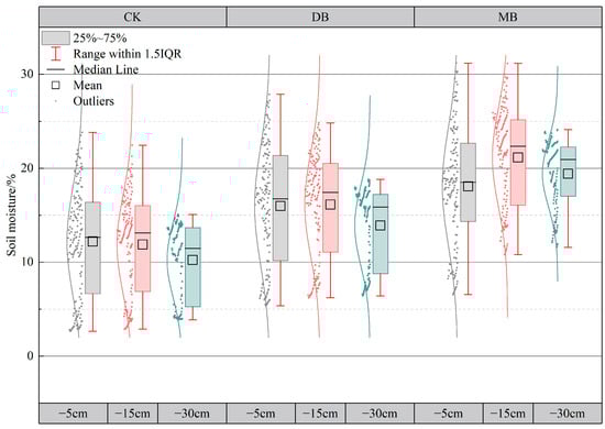 Soil wetting and drying have obvious seasonality because the distribution of the rainfall season is uneven, mostly distributed in late summer and early autumn, and there is less rainfall in spring in the Loess Plateau hilly region [23]. Figure 7 shows the soil water content at 5, 15, and 30 cm below the furrow surface between the ridges in different treatments. The soil water content for the same layer among the three groups showed MB > DB > CK, MB treatment was better in preserving soil water, and CK treatment was the worst. Figure 8 reflects the dynamic changes in soil water content in each layer of different treatments. The variation in soil water content decreases with the increase in depth. Over time, the soil water content shows a decreasing–rising trend under the alternating effect of evaporation and rainfall during the monitoring period. Starting from sowing, the water consumption gradually increases, and the soil water content decreases with the growth of crops and the gradual increase in evaporation intensity. Subsequently, the soil water content began to increase when supplemented by rainfall in late summer.