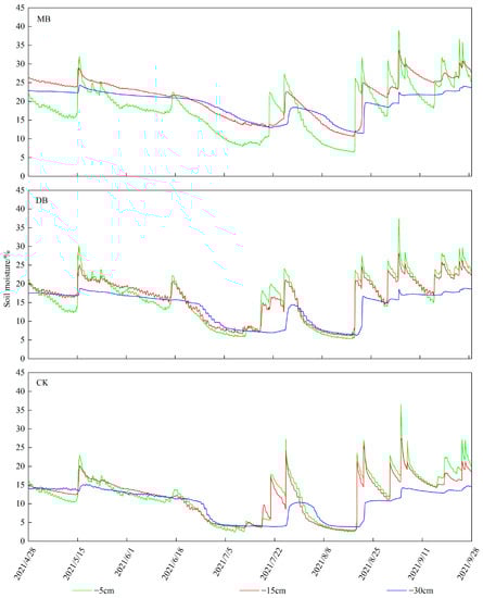 The total rainfall of heavy rain (HR) was 43.2 mm, lasting about 20 h. The soil water content in the 5 cm soil layer in the three treatments showed an increasing trend immediately after the rainfall occurred, with a rate of increase of 94.82%, 87.75%, and 84.78%, respectively. The 15 cm soil layer in the three treatments also showed an increasing trend. MB increased almost simultaneously with the 5 cm soil layer and had a rate of increase of 29.87%. DB and CK lagged relatively with a time of 0.5–1 h and had a rate of increase of 29.31% and 25.92%, respectively. The 30 cm soil layer also showed an increasing trend, and all treatments had a lagging effect. MB had the shortest lagging time, with a rate of increase of 9.26%, and that in CK was the longest, with a rate of increase of 7.56%.