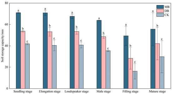 Figure 9 reflects the variation in soil water storage during the maize growth period. It can be seen that the soil water storage of MB treatment was significantly higher than DB and CK at each period. As the consumption of soil water by the crop increased, the soil water storage of each treatment gradually decreased, with the minimum value appearing in the filling stage, and the soil water storage gradually began to recover in the mature stage. The average water-storage capacity of MB treatment was significantly higher than DB by 35.5% and CK by 85.1% throughout the growth period. The average soil water storage of MB was 71.06 mm at the seedling stage and 55.60 mm at the mature stage, with a rate of decrease of 21.75%. That of DB was 53.70 mm at the seedling stage and 42.06 mm at the mature stage, with a rate of decrease of 21.68%. That of CK was 41.87 mm at the seedling stage and 29.80 mm at the maturity stage, with a rate of decrease of 28.83%. The rate of decrease in MB was significantly lower than DB and CK, which means MB treatment slows down soil water consumption.