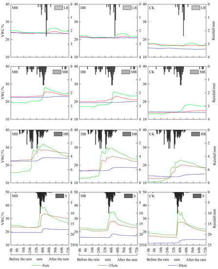 Effect of different types of rainfall on soil moisture. MB: Plastic membrane–geotextile cloth mulching on the ridge; DB: Geotextile cloth mulching on the ridge; CK: Bare soil ridge. VWC refers to the volumetric water content of the soil. LR, MR, HR, and S stand for light rain, medium rain, heavy rain, and storm rain, respectively.