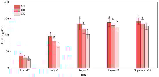 The height of plants for each treatment is shown in Figure 11. The average plant height among the three groups was in the order of MB > DB > CK. The difference was statistically significant (p < 0.05). The mean plant height in MB and DB was 22.81% and 10.79%, respectively, higher than in CK in five monitoring sessions.