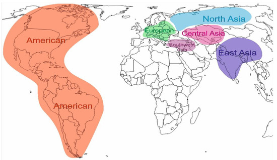 A total of 100 proso millet (Panicum miliaceum L.) varieties and accessions of various ecological and geographical origins served as the experimental material. Approximately 50 accessions were sourced from the germplasm collection of the Peginal Plant Introduction Station (the world collection of the USDA), Iowa State University (USA). The germplasm collection was divided into 6 groups based on origin: American, European, East Asian, Southwest Asian, Central Asian and North Asian (Figure 1).