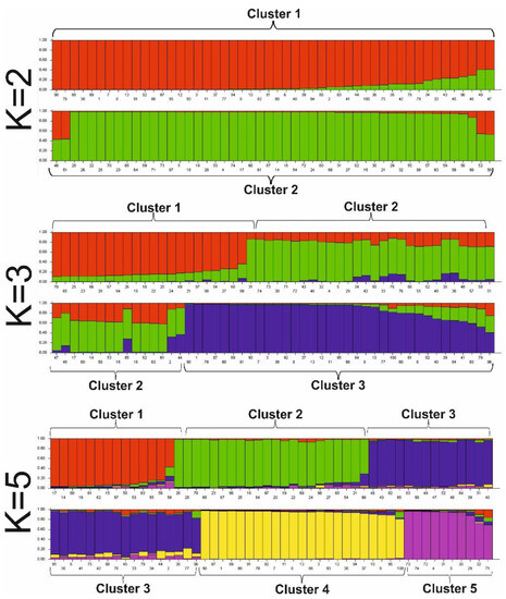 Population structure analysis results of 100 proso millet accessions: clustering diagram at K = 2, at K = 3 and at K = 5.
