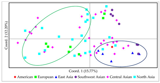 A score plot of Coord.1 and Coord.2 showed the relationships among the 100 accessions. The PCoA clearly separated the East Asian group from the others. The majority of the East Asia accessions clustered together on the bottom right of the plot. The Southwest Asian genotypes werelocated alongsidethe accessions from Central and Eastern Asia (top and bottom right). The European and American groups presented an intermediate position between the Central and North Asian groups. The accessions from Central Asia and Northern Asia were distributed across the whole spectrum, which was similar to the pattern shown inthe population structure and UPGMA dendrogram analyses. The PCoA using the origin data revealed that most of the genotypes of Central Asian origin were genetically closer to the North Asian group.