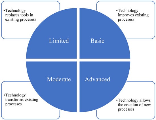 The proposed model is based on the SAMR educational framework. Initially developed by Dr. Ruben Puentedura in 2006, this model was proposed to analyze and evaluate technology integration in the classroom [34]. The primary purpose of the SAMR model is to help teachers and instructional designers understand how technology can transform teaching and learning experiences. It provides a framework for categorizing different levels of technology integration, ranging from basic substitution to more advanced redefinition. At the “substitution” level, technology is used as a direct substitute for traditional pedagogical tools without any significant functional changes. At the “augmentation” level, technology enhances the learning process by providing additional functionalities. At the “modification” level, technology allows for significantly redesigning the learning task. Finally, at the “redefinition” level, technology creates entirely new learning experiences, transforming the learning task into something previously unimaginable without technology [35]. While the SAMR model is primarily designed to analyze and evaluate the integration of technology in education, it could also be adapted to be applied in other fields.