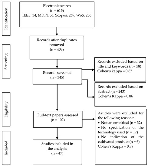 Studies were first selected based on their title and keywords. The title and keywords of all articles were scanned to remove irrelevant studies. Fifty-eight studies were deemed irrelevant and removed; hence, this process yielded 345 studies. The abstract of each study was then read. This allowed us to remove 243 studies either because they were review articles, reports, dissertations, work-in-progress articles, or did not address the aim of our study. Thus, this process resulted in 102 articles. Next, we selected the studies that met the following conditions: (a) empirical studies, (b) studies that specify the technology used in the production process, and (c) studies that specify the cultivated product. These criteria led to a selection of 47 academic articles to be further examined and included in the analysis. The reference list of each paper was then scanned, but no additional study was found. The PRISMA flowchart of the study selection process is shown in Figure 2.