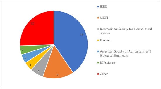Results in Figure 4 show that IEEE published the largest number of studies in the present systematic review (40% of the studies) followed by MDPI (15% of the studies). On the other hand, the number of studies published by Elsevier and Springer (two studies each) is strikingly low, as they are considered two of the most important academic publishing companies. Twelve studies were published by journals that do not belong to a specific publisher but are instead associated with universities or academic institutions. Additionally, it is important to mention that 24 studies (51%), were presented at scientific conferences and published as conference proceedings.
