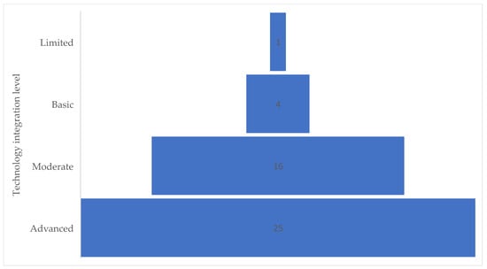 Finally, the results indicate that the most common level of technology integration is “Advanced”, which supposes that technology has been implemented with the purpose of redefining and creating new processes. It is important to note that the level of technology integration depends on factors such as budget, system scale, and the goals of the aquaponics project. In summary, integrating technology into aeroponics can reshape modern agriculture by fostering sustainable practices, increasing yields, mitigating resource constraints, and assisting in achieving the zero-hunger sustainable goal. As technological advancements evolve, careful consideration of both the benefits and limitations will pave the way for a more efficient, productive, and resilient aeroponic cultivation system.