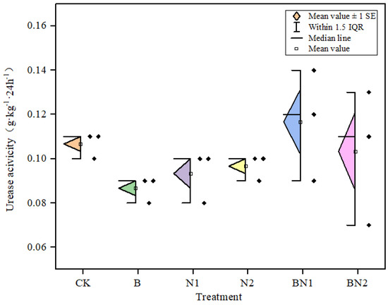 The application of biochar mainly changes soil physical-chemical properties, improves soil nutrient metabolism, and indirectly affects soil microbial community structure [21,22]. Research has found that, in contrast to no fertilization, applying biochar can increase microbe quantity. Bacteria quantity reaches its peak when the usage of biochar is 0.30% [23]. This study shows that the application of biochar and nitrogen fertilizer can both increase bacterial quantity. However, the effects are influenced by the amount of nitrogen fertilizer applied and whether it is applied in combination with biochar. Due to the porous structure and large surface area of biochar, adding biochar can directly provide a suitable habitat environment for the bacterial community and a possibility for an increase in bacterial quantity [24,25,26]. Meanwhile, this study also finds that adding biochar alone will inhibit urease activity, while the combined application of biochar and nitrogen fertilizer can promote urease activity. Analysis shows that carbonaceous materials in biochar are hard to decompose and thus cannot be hydrolyzed by urease quickly [27]. It can be deduced that the regulatory effects of biochar on soil fertility are not fully exerted, and its long-term effects should be further studied.