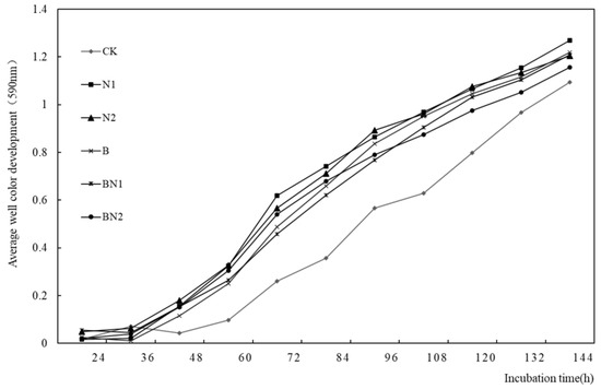 Metabolic diversity analysis of soil microbial communities was conducted on the average of 96 h absorbance values of soil incubation under different treatments (Table 2). The Shannon index (H) was used to assess species richness, the McIntosh index (U) was used to evaluate community species evenness, and the Simpson index (D) was used to estimate the dominance of some of the most common species. The results show that, compared with CK, the richness and evenness of soil microbial species also show an upward trend under different fertilization treatments. The overall performance displays that when applying nitrogen fertilizer alone, soil microbial metabolic activities are the strongest, followed by applying biochar alone, and when nitrogen fertilizer is applied combined with biochar, the soil microbial activity is the lowest. Due to the difference in soil environments under different fertilization treatments, the difference in soil microbial dominance under different treatments is not significant. It indicates that the pore structure of biochar may affect the release of nitrogen fertilizer and inhibit the microbial absorption of nitrogen fertilizer, thus reducing microbial activity. Furthermore, combined with the analysis of soil microbial carbon source utilization results, it demonstrates that fertilization treatments chiefly change the metabolic activities of soil microorganisms.