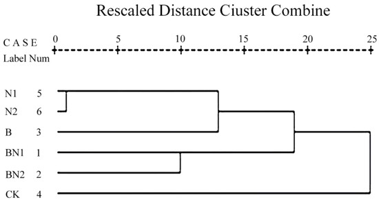 The cluster analysis results show that the single application of nitrogen fertilizer (N1 and N2) is the first category. The single application of biochar (B) is the second category. The combined application of biochar–nitrogen (BN1, BN2) is the third category. The CK is the fourth category. Based on the comprehensive score results of the factor analysis, these four categories of six treatments can be divided into four grades: Grade 1 = [BN1, BN2]; Grade 2 = [B]; Grade 3 = [N1, N2]; and Grade 4 = [CK].