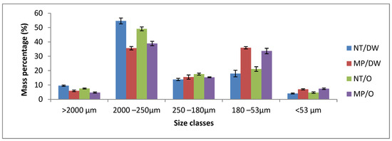Finally, the percentage of clay and silt particles (<53 µm) was influenced solely by the tillage regime (p < 0.0001) (Table 3), with soils from NT plots containing 4.38% of this aggregate class, compared to 7.18% for soils from MP plots (Figure 3). NT plots were associated with the highest values of aggregates larger than 250 µm and the lowest values of aggregates smaller than 180 µm.
