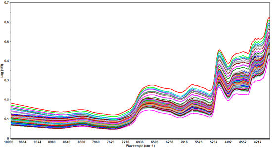 The average spectrum of three measurements (Figure 1) was used as the final spectrum of each sample to assess the potential of prediction by NIRS. The PLS algorithm yielded the optimal models, characterized by a limited number of latent variables, low RMSEcv, high R2cal values, and superior predictive capabilities. A few outliers were identified through an analysis of leverage and studentized residuals, and these outliers were subsequently removed.
